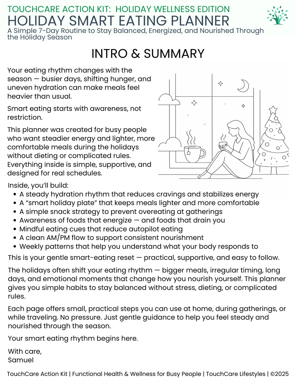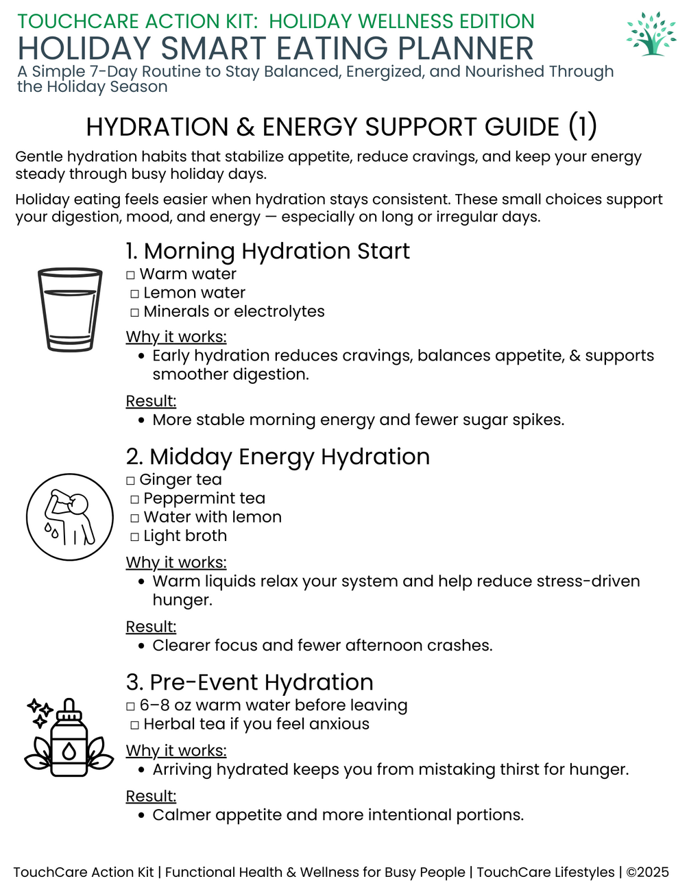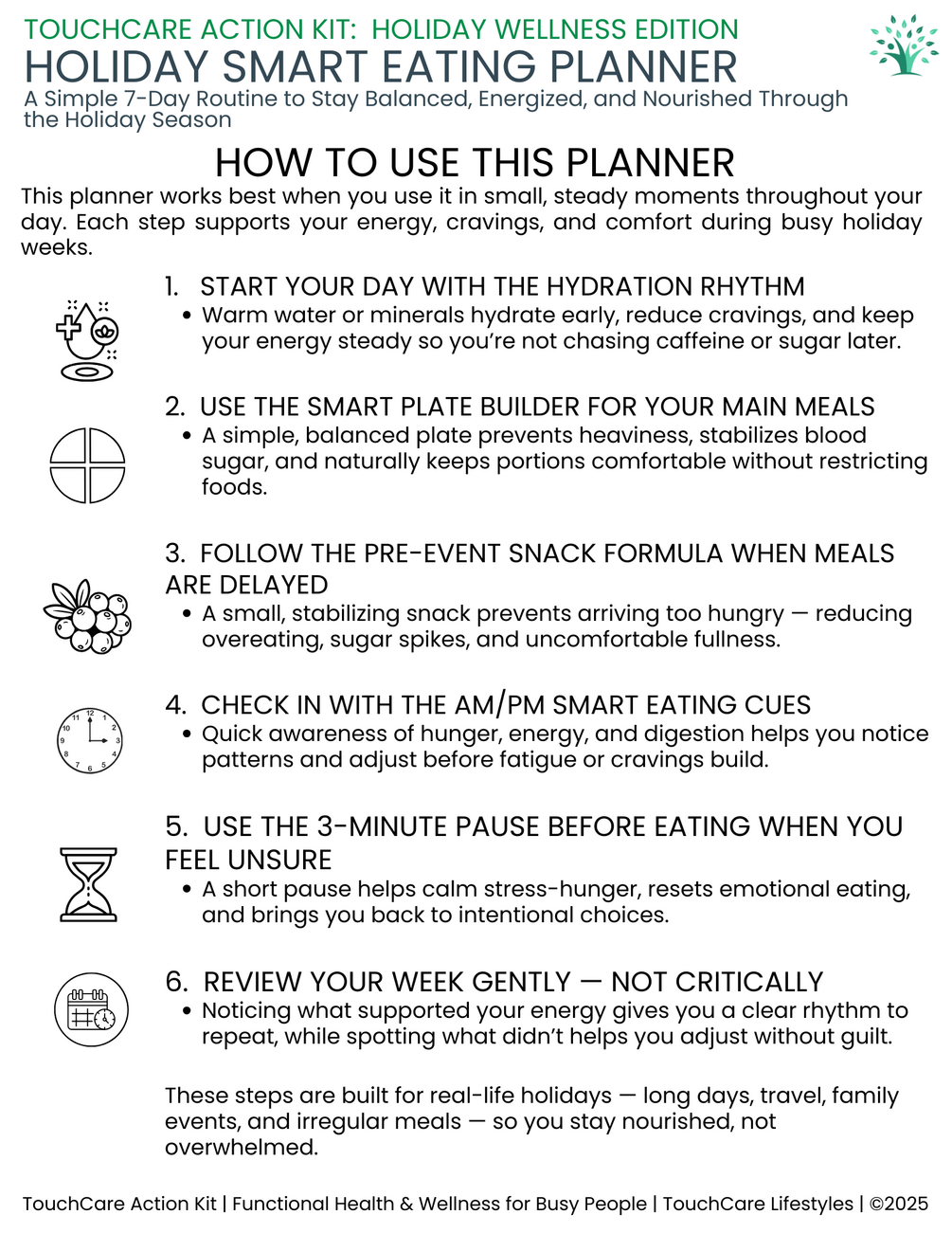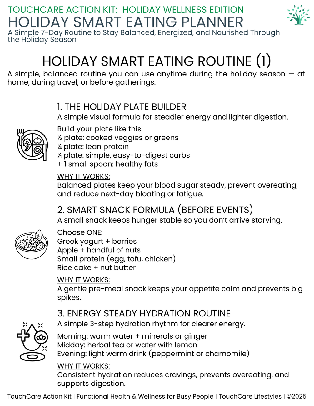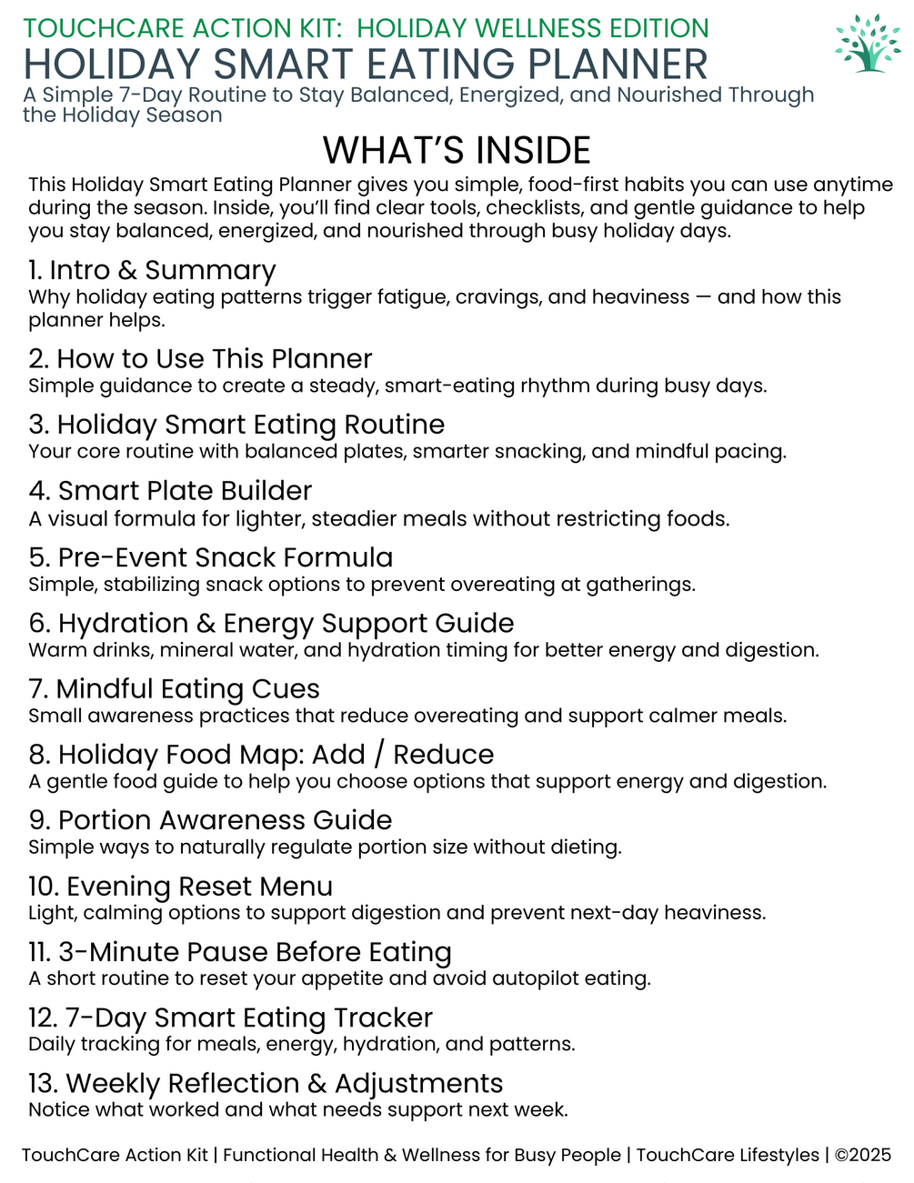 Holiday meals tend to be heavier, schedules more chaotic, and hunger cues harder to read. This TouchCare Action Kit gives you a simple, steady rhythm you can use every day to support better energy, calmer eating, and lighter digestion.
