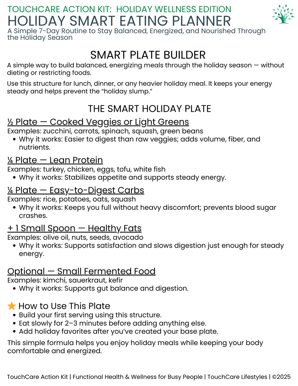 The Holiday Smart Eating Planner is a gentle, food-first system designed to help you stay balanced, energized, and comfortable during the holidays — without dieting, guilt, or complicated rules.